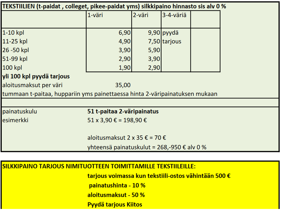 TEKSTIILIEN SILKKIPAINATUSHINNASTO (tekstiilipainoväri painetaan kankaan pintaan ja kuivataan)